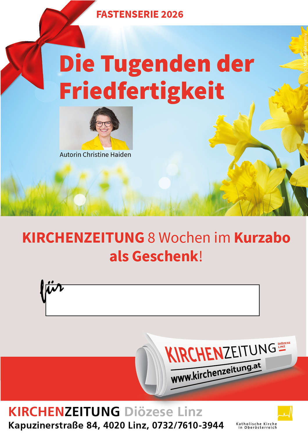 Schenken Sie die Kirchenzeitung gedruckt und digital. Damit hat die beschenkte Person Zugang zum ePaper auf der Homepage, den K+ Premiumartikeln und zur APP "Kirchenzeitung Linz".