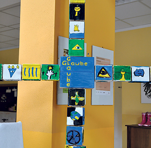 Zum Jahr des Glaubens hat Religionslehrerin Doris Niederfeichtner ihre Schüler/innen der 4. Klassen Volksschule angeleitet, sich mit dem Glaubensbekenntnis auseinanderzusetzen. Die beeindruckenden Ergebnisse sind in der Schulaula als Ausstel­lung zu sehen. Aus den bildnerischen Arbeiten der Kinder ist ein Kreuz entstan­den. Die Texte, die sie dazu verfasst haben, deuten das Kreuz als Zeichen des christlichen Lebens und der Hoffnung.