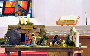Der Stein ist weggewälzt, das Grab ist leer, zwei Frauen stehen davor. Daneben Tiere am Feld und Blumen. „Gestorben wird immer, aber auch auferstanden“, so P. Martin Spernbauer in der Predigt. Er wies auf viele Seiten der Auferstehung im täglichen Leben hin.