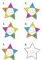 Fünf Sterne, ganz ähnlich und doch nicht gleich! Mit gleichem Gehalt, allerdings fünf Mal anders angeordnet, dabei einer Logik folgend. Wenn Sie die Logik erkennen, wissen Sie, wie der sechste Stern aussehen muss.