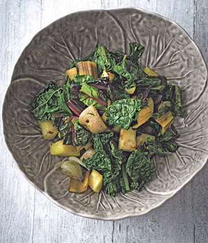 Schalotten in einer Pfanne in Öl gemeinsam mit den Sonnenblumenkernen anrösten. Topinambur und Erdäpfel dazugeben. Knoblauch schälen, in die Pfanne pressen oder klein geschnitten dazugeben. Mangold in die Pfanne geben und kurz mitrösten, mit Salz und Pfeffer würzen.