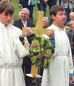 Nach acht Jahren konnte die Renovierung der Filialkirche St. Valentin mit einer Turmkreuzsteckung (Turmkreuz im Bild rechts), einer liturgischen Feier und einer Sternwallfahrt am 23. September abgeschlossen werden. Die Sanierung umfasste den Außenbereich mit Turm und Fenstern sowie die Heiligenstatuen. Sehr lange dauerte es dabei, bis die feuchten Mauern austrocknen konnten. Das Gotteshaus ist unter den Kirchgängern beliebt als Hochzeits- und Taufkirche. Zudem wird dem sogenannten Heiligwasser aus dem Brunnen der Wallfahrtskirche heilende Wirkung bei Augenkrankheiten nachgesagt. Ab sofort ist die Kirche wieder benutzbar und es ist wie gewohnt möglich, Wasser aus dem in der Kirche befindlichen Brunnen zu schöpfen. Bild: Pfarre/ Malzer