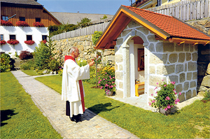 Familie Grasböck errichtete nun beim Hauszugang eine Kapelle, die Stadtpfarrer P. Michael Wolfmair kürzlich segnete. Im Inneren befindet sich auch ein Bild der Hohenfurter Madonna, da sich der Unfall im Pfarrgebiet des tschechischen Hohenfurt ereignete.