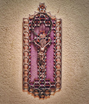 Der Christus-Corpus ist eingerahmt von gestanzten Metallresten, die wiederum mit einer Borte durchzogen sind. Ein Christus am Metall-Kreuz. Als Untergrund ist ein fliederfarbener Teppich-Rest zu erkennen. Ein Strahlenkranz oder ein Heiligenschein ist im oberen Teil zu sehen – ein kleines Werk der Handwerkskunst mit vielen Details. Die Arbeit ist vermutlich in den 1960er Jahren im Hausruckviertel gefertigt worden. – In dieser Zeit ist in Italien die „Arte Povera“ („arme Kunst“) entstanden. Es ist Kunst, die gewöhnliche, einfache Materialien aus dem Alltag sowie Natur- und Abfallprodukte verwendet. Viele der meist räumlichen Installationen sind nach einiger Zeit im Museum gelandet. – Dieser hier dargestellte Jesus aus Materialresten begleitet seit Jahrzehnten Bewohner/innen beim Betreten und Verlassen des Hauses. Unscheinbar, mitten im Alltag.