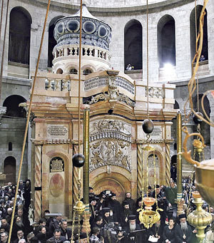 Die Ädikula-Kapelle über dem Heiligen Grab geht in ihrer aktuellen Gestalt im Stil des osmanischen Spätbarock auf das Jahr 1809/10 zurück. Die Kapelle bildet das Zentrum der Grabeskirche, die von den östlichen Christen Auferstehungskirche („Anastasis“) genannt wird. Diese Kirche wurde ursprünglich von Kaiser Konstantin ab dem Jahr 326 errichtet, nachdem seine Mutter, die Heilige Helena, die Orte der Passion Jesu in Jerusalem gefunden hatte. In der Folgezeit wurde die „Anastasis“ immer wieder halb zerstört und wieder aufgebaut. Sie ist bis heute einer der wichtigsten Pilgerorte der Welt.