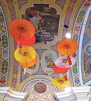 90 bunte Schirme, versehen mit den Vornamen der Firmkandidat/innen, hingen von der Kirchendecke der Pfarrkirche