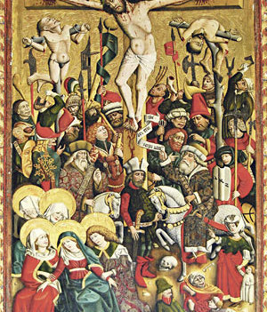 Ganz unten, rechts im Bild ist sie zu sehen: die Frau mit Kind. Sie hält das Kind an der Hand, weist mit der anderen auf den Gekreuzigten. Das Passionsbild ist das mittlere Tafelbild des berühmten Hallstätter-Altars.
