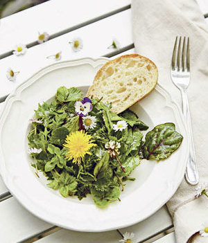 ∙ Milde Schnitt- und Pflücksalate oder Vogerlsalat ∙ junge Mangoldblätter ∙ Blätter mit scharfem Kressearoma wie Rucola oder junge Asia-Salate ∙ Wildkräuter und Blüten (Pimpinelle, Schafgarbe, Spitzwegerich, Blätter und Blüten vom Löwenzahn, Erdbeer- und Himbeerblätter, Gundelrebe, Blätter und Blüten von Gänseblümchen, Blüten vom Klee, Hornveilchen, Primeln) ∙ Saure Frühlingsgartenkräuter (Blutampfer, Sauerampfer, Winterportulak) ∙ Junge Oregano-Spitzen oder Thymiannadeln für mediterranen Geschmack