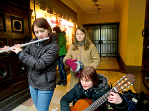 Wie reagieren die Leute auf der Landstraße? Sehr unterschiedlich. Viele sind vom Einkaufen gestresst, manche ignorieren uns und machen abwertende Bemerkungen, wie: „Die haben doch sowieso viel mehr als wir.“ Viele Leute gehen anscheinend auch ohne Geld einkaufen. Doch wir bekommen sehr viel Lob für die Musik und dafür, dass die Aktionen von uns und nicht von einer Organisation wie der Caritas ausgehen. Viele haben auch Musikwünsche. Mit Leuten kommen wir ins Gespräch und wenn einer spendet, spenden gleich mehrere. Die Musik ist dabei ganz wichtig. Wenn wir nicht spielen, spenden die Leute gleich weniger. Erinnerst du dich an ein besonderes Erlebnis? Wir wollten mit dem „Einfach-raus-Ticket“ nach Linz fahren, doch leider kauften wir die Karte für den falschen Tag. Die Schaffner ließen uns freundlicherweise doch fahren, einer spendete sogar etwas. Im Zug spielten wir uns dann etwas warm, die Leute hatten viele Musikwünsche. Und einmal, als wir fragten, ob wir uns bei einem Geschäft unter dem Dach hinstellen dürften, brachte uns die Verkäuferin sogar Schokolade. Allgemein waren die Aktionen immer lustig.