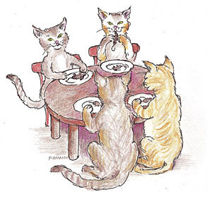 Lilli lässt sich neben Lola niederfallen und schmiegt sich ganz eng an sie. „Ich hab mir auch schon einen Namen ausgedacht“, flüstert Lilli noch ganz atemlos: „Muki für ein Kätzchen und Meki für ein Katerchen.“ „Weißt du was!“, jauchzt Lola: „Das müssen wir feiern! Ich lade dich und deine Eltern zum Abendessen ein! Mäusebraten nach Art des Hauses, dazu knackigen Katzengrassalat und frischen jungen Gänsewein aus dem Brunnen im Garten! Sagen wir um fünf Uhr! Lauf heim und sag ihnen Bescheid! Ich fange gleich mit den Vorbereitungen an.“ Und schon ist Lola im Haus verschwunden. Lilli aber hüpft freudig nach Hause.