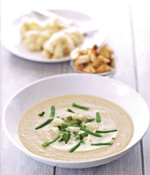 Zwiebelwürfel und die weißen Lauchringe in heißem Öl etwa 5 Minuten unter Rühren anschwitzen. Den Karfiol und die grünen Lauchringe dazugeben, mit der Brühe und der Milch aufgießen und kurz aufkochen lassen (Vorsicht: die Milch geht leicht über). Dann auf niedriger Temperatur das Gemüse 10 bis 15 Minuten köcheln lassen. Die Suppe fein pürieren, mit Salz, Pfeffer und Muskat abschmecken und mit Schnittlauch garnieren.