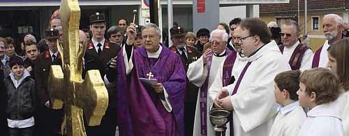 - Gunskirchen. Seit vergangenen Sonntag, 27. März, strahlt das Turmkreuz der Gunskirchner Pfarrkirche wieder in goldenem Glanz. Bischofsvikar Josef Ahammer hat mit der Pfarrgemeinde die Festmesse gefeiert und das Kreuz am Kirchenplatz gesegnet (Bild). Ein Sturmschaden aus dem Jahr 2009 hat die Sanierung des barocken Kirchturms erforderlich gemacht. Die Kosten dafür beliefen sich auf 450.000 Euro.