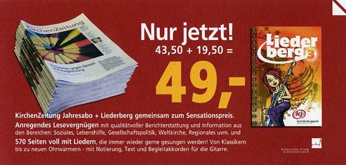 | JA, ich bestelle ein JAHRES-ABONNEMENT der KirchenZeitung und den LIEDERBERG im Kombiangebot um nur Euro 49,-. (Das Abonnement beginnt mit der nächstfolgenden Ausgabe für mindestens ein Jahr und danach bis auf Widerruf, Kündigung zum Halbjahr, schriftlich mit 14-tägiger Kündigungsfrist.) |