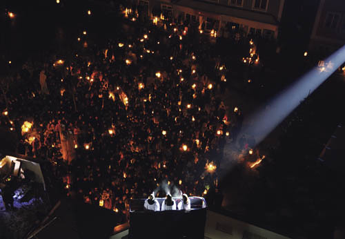 Aistersheim. Zum zweiten Mal nach 2008 fand am vergangenen ersten Advent-wochenende in Aistersheim eine Open-Air-Inszenierung des Weihnachtsevangeliums statt. Im ganzen Ortszentrum war es während der Aufführung dunkel. Kein elektrisches Licht und kein Verkehrslärm störten dabei die Ruhe. 250 Einwohner des 830-Seelen-Ortes wirkten an den drei Abenden aktiv mit. Unter anderem trug die Pfarre mit dem Kirchenchor zu dem stimmungsvollen Abend bei. Mehr als 2000 Besucher/innen machten sich selbst auf den über zweistündigen „Weg nach Bethlehem“ und waren tief ergriffen von der besonderen Adventstimmung.