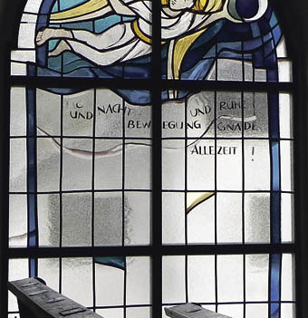 Mit den Sinnen. Auf den Fenstern sind Hildegard von Bingen, Christophorus, Petrus und Paulus sowie sechs Engel zu sehen, die biblische Erzählungen mit menschlichen Erfahrungen in Beziehung setzen. So geht es beim Engel, der den Frauen das leere Grab Jesu deutet, um das Hören und beim Kampf Jakobs mit einem Engel um das Tasten und Spüren. Auf der Orgelempore sind jetzt auch zwei Bildtafeln von Weiss zu sehen, die die Geburt Christi und die Flucht nach Ägypten zeigen.