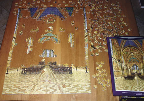 Zuerst werden die Randsteine gesucht. Das schaffen scharfe Augen noch relativ schnell. Aber dann! – Wie soll ein Fliesenboden einer Kathedrale Stück für Stück aus dem Heuhaufen von Stecknadeln, nein kleinen Puzzleteilen, zusammengefügt werden? Wie soll man sich im Dickicht der feinsten Farbschattierungen vorarbeiten?
