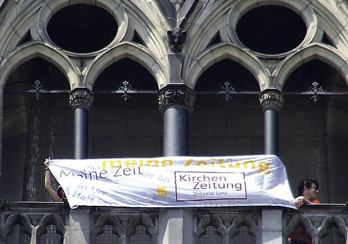 Linz, Mariendom. Man kann den Dom auf viele unterschiedliche Arten und Weisen erleben. Etwa bei den Morgenmeditationen am 27. Juli, 24. August, 14. September, jeweils um 6.16 Uhr. Treffpunkt: Turmportal Baumbachstraße. Täglich, außer Sonn- und Feiertag gibt es um 12.15 Uhr in der Krypta Zeit zum Innehalten in der Mitte des Tages. Dienstag bis Sonntag von 12 bis 19 Uhr bietet die Rudigierhalle, der Ruhepol, Besucher/innen einen Ort der Ruhe. Eine gute Möglichkeit, geschichtliche Einzelheiten und kunsthistorische Details über den Dom zu erfahren, bieten die Domführungen. Nur im Zuge dieser Führungen kann der Turm erklommen und die Höhengänge erforscht werden. Dank dem Dom-Mesner Sigi Hafner bekam die KirchenZeitung eine Sondergenehmigung und konnte für dieses Foto ein riesiges Plakat am Domturm anbringen (siehe Bild). Die einmalige Akustik der Kirche wird bei den Orgelstationen, freitags von 2. Juli bis 27. August um 17 Uhr, erlebbar. Jeweils vor den Orgelstationen, um 16.15 Uhr, wird eine Orgelführung durch den Organisten angeboten.