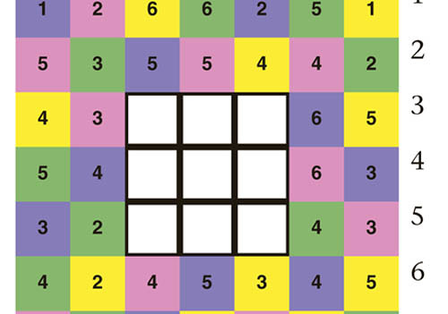 Auf dem untypischen Schachbrett rechts – es hat nur 7 x 7 Felder und ist zudem bunt – suchen Sie sich mit einem Pferd einen Startplatz auf einem der weißen Felder in der Mitte.