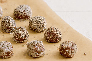 Zubereitung Schokolade mit Öl und Sirup in einem Topf bei schwacher Hitze schmelzen. Topf vom Herd nehmen, restliche Zutaten unterrühren. Aus der Masse ca. 25 Kugeln formen, im Kühlschrank fest werden lassen (Kugeln bei Kälte gut haltbar).