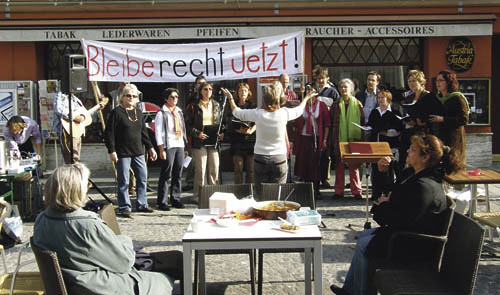 „Wir stehen hier, weil es uns nicht gleichgültig ist, wenn Menschen neben uns in ständiger Angst leben müssen, ob sie abgeschoben werden.“ – Was das Vokal- und Instrumentalensemble MIRA beim Platzkonzert in Vöcklabruck anlässlich des österreichweiten „Tages des Bleiberechts“ am 10. Oktober so ausdrückte, war das Anliegen aller, die an den landesweiten Kundgebungen teilnahmen und bekräftigten: Es ist genug Platz. Alleine in Oberösterreich versammelten sich etwa tausend Menschen – in Linz und Vöcklabruck. Unter ihnen waren beim Sesselmeer am Linzer Hauptplatz Bischof Dr. Ludwig Schwarz und beim Platzkonzert in Vöcklabruck, Dechant Josef Friedl. Er mahnte: „Wir kennen viele Opfer. Aber wer nennt die Täter beim Namen? Wir werden dereinst gefragt werden: `Ich war fremd und ihr habt mich nicht aufgenommen’.”