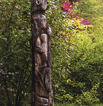 Kreativ.Ein toter Baumstamm ist beschnitzt ein Blickfang im Garten. Wo er nicht bearbeitet wird, sollte die Rinde am Stamm bleiben. Die meisten „Erstbewohner“ brauchen sie.