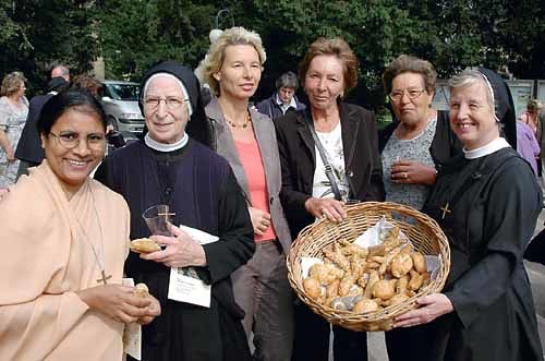 Mehr als 1.000 Gäste feierten am 16. September 2006 gemeinsam mit den Kreuzschwestern das Fest zum 150-Jahr-Jubiläum der Ordensgemeinschaft. Bischof Ludwig Schwarz betonte in seiner Predigt, dass die Menschen nach Frauen Ausschau halten, die für Gott und in Gott leben: „Wir danken den Kreuzschwestern, dass sie dieses Zeugnis geben.“ Im Anschluss an die Messfeier gab es vor dem Dom ein Beisammensein bei Brot und Wein. Zu den Gästen gehörte auch Sr. Roseline aus Indien (links). Die Provinz OÖ/Salzburg unterstützt seit Jahrzehnten finanziell und personell den Aufbau der inzwischen großen Kreuzschwesterngemeinschaften in Indien bei.