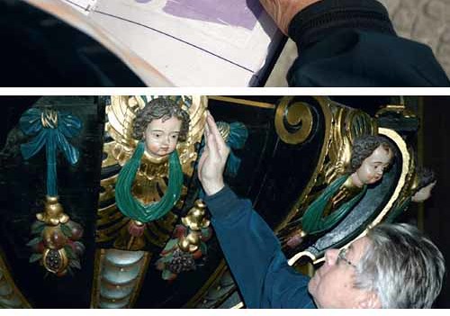 Fotos von oben nach unten: Die Fassade auf der Südseite - ertastbar im taktilen Kirchenführer; Barocke Engel auf der Kanzel; Helmut Dolezal fand auch die versteckte Jahreszahl (1466) am Nordportal. Fotos: Christian Ortner.