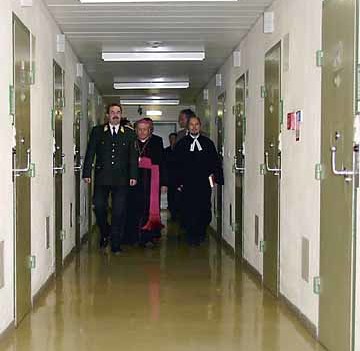Bischof Ludwig und Superintendent Gerold Lehner auf dem Weg durch den Häftlingstrakt des Gefangenhauses Linz zur Feier, die vom katholischen und vom evangelischen Gefangenenseelsorger vorbereitet wurde. Oberstleutnant Ludwig Bruchmann von der Justizwache begleitet die kirchlichen Würdenträger. Foto: KIZ / Ernst Gansinger