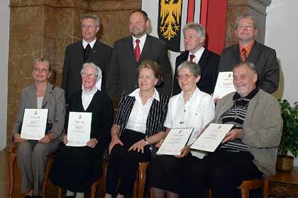 Vorne sitzend (v.l.): Doris Kroll, Sr. Roswitha Karrer, Ploier-Witwe Maria, Sr. Hildegard Enzenhofer, P. Hubert Leeb. 2. Reihe: Generalvikar Maximilian Mittendorfer, Landesrat Josef Stockinger, Landeshauptmann Josef Pühringer und KIZ-Redakteur Josef Wallner.