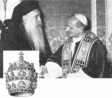 Patriarch Athenagoras und Papst Paul VI. bei der wichtigen Begegnung 1964. Der Papst verzichtet auf das Machtsymbol.