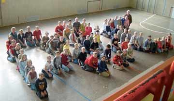 Im Turnsaal haben sich die Schüler und Schülerinnen der a-, b- und c-Klassen der Hauptschule Taiskirchen zu einem großen ABC für das Foto gruppiert. Wenn viele auf der Welt doch dieses ABC des Helfens lesen und verstehen würden, sähe es besser aus.