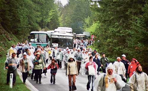 „Wir sind schon seit zwölf Stunden im Einsatz“, begrüßte Ursula Schmidinger von der Katholischen Jugend Oberösterreich die Linzer Gruppe. Sie gehörte dem Team an, das den Pilgern den richtigen Weg zum Festgelände weisen sollte. Bis zwei Uhr dauert ihr Dienst noch. Koordiniert hat die Schar der Bus-Einweiser/innen ein Oberösterreicher: KA-Generalsekretär Bernhard Rudinger. Die meisten zollten den Organisatoren Respekt. Rund 2.000 Pilger aus Oberösterreich haben die „Wallfahrt der Völker“ miterlebt, manche sogar als Fußwallfahrer, wie die Gruppe aus dem Priesterseminar oder von der Katholischen Hochschulgemeinde. Für die früh gekommenen Oberösterreicher hieß es zunächst beim Vorprogramm geduldig warten. Über die ausgeteilten Radios können sie die Übersetzungen von Ansprachen und Liedern aus den verschiedenen Teilnehmerländern hören. Gegen 9 Uhr trifft die Prozession der Bischöfe mit der Mariazeller Madonna auf der Pferdekutsche ein. Die Glocken, darunter eine von der Diözese Linz gespendete, kündigen das Eintreffen an, sie setzen sich gegen den Lärm der Hubschrauber durch, die das Gelände umkreisen. Der Festgottesdienst selbst war in der Tat zu einem „geistlichen Europafest“ geworden, wie Ortsbischof Egon Kapellari angekündigt hatte. Er endete mit einem oberösterreichischen Akzent: mit Anton Bruckners „Ave Maria“. Für viele ist die Wallfahrt der Völker auch noch zu einer Fußwallfahrt geworden, mit der sie nicht gerechnet hatten. Busse, die sehr früh angekommen waren, bekamen ihre Parkplätze am weitesten entfernt. So musste auch Herr Neumüller mit der aus Linz aufgebrochenen Gruppe einen 17 Kilometer langen Marsch über den Zellerrain machen, vorbei an oder zwischen den abfahrenden Bussen, die ebenfalls im Schritttempo unterwegs waren. Wer hätte schon gedacht, dass man heute noch zu Fuß die Grenze nach Niederösterreich überschreiten würde? Nach vier Stunden Marsch ist die Gruppe endlich beisammen. Der lange Weg hatte etwas Besonderes: Man vernahm kaum Murren, trotz der Erschöpfung, die sich bei manchen breit machte. Wer nicht mehr konnte, wurde von Feuerwehr und Rotem Kreuz oder von den Maltesern versorgt und zum richtigen Bus gebracht. Während der langen Wanderung trifft man auch immer wieder auf oberösterreichische Gruppen. Die Gehörlosenseelsorge ist mit einem Bus da. Aus allen Vierteln Oberösterreichs begegnete man Bussen und Pilgern. Nach einigem Warten erreicht die letzte Wallfahrerin den Linzer Bus. Rotkreuzfahrer haben sie „aufgelesen“ und das letzte Stück Weg hergebracht. Sr. Anna Maria, die die Erkennungsfahne für die Linzer Gruppe genäht hat, hat es aus eigener Kraft geschafft – und hat allen Grund, sich darüber zu freuen.19 Stunden nach der Abfahrt am frühen Morgen tauchen die Lichter der Linzer Stadtautobahn auf. Nach Altenberg hinauf ist es auch für Erich Neumüller jetzt nicht mehr weit.