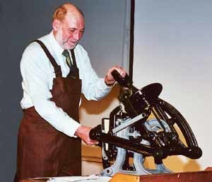 Bild: Eberhard Bruderhofer schwärmt für alte Druckmaschinen. Zum Abschied schenkte ihm seine Belegschaft ein Gerät aus der Zeit um 1950.