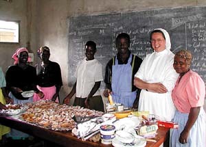 Die Menschen in der Pfarre Kyengeza empfingen Sr. Elisabeth Brunmayr und Sr. Antonia Dulong im Juli 2002 so herzlich, dass sich die beiden Ordensfrauen von Anfang an in ihrer neuen Heimat wohl fühlten und rasch in ihre neuen Arbeitsfelder hineinfanden. Ende März kam Sr. Margit Zimmermann nach und die Drei Frauen-Kommunität geht nun daran ein kleines Haus zu bauen mit sechs Schwestern- und sechs Gästezimmern. Die Diözese hat den Schwestern dafür ein Grundstück von einem Hektar Größe zur Verfügung gestellt. „Das klingt nicht übel, aber man muss bedenken, dass man hier Selbstversorger ist“, erklärt Sr. Elisabeth. Außerdem war die Fläche undurchdringlicher Busch. Doch mit Hilfe von jeweils über vierzig Helfern wurde an drei Samstagen das Gelände von Gestrüpp gesäubert. „Die Arbeit wurde zu einer schönen Erfahrung“, so Sr. Elisabeth: „Danach setzten wir uns auf der Wiese zusammen und hatten ein wunderbares Mahl: Reis und Coca Cola.“ Bis zum Baubeginn wird es noch dauern, die Schwestern nutzen aber schon ihr Grundstück. Sie haben einen Gemüsegarten angelegt. Die Leute warnen jedoch die Schwestern: „Hoffentlich stehlen euch nicht alles die Affen.“