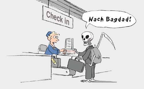 Der Tod will sich einchecken. Die Chance, dass ihn die Kontrolle stoppt, ist leider gering.