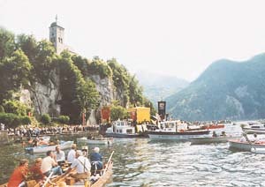 Traunkirchen, Hallstatt und Aschach/Donau sind in Oberösterreich mit der Tradition von Wasserprozessionen zum Fronleichnamsfest verbunden. Auch heuer wird es sie wieder geben; ihre Anziehungskraft für viele Gäste aus Nah und Fern ist groß. Die Tradition der Wasser-Prozessionen reicht Jahrhunderte zurück. In Hallstatt ist eine Seeprozession erstmals 1623 urkundlich erwähnt; sie gilt seit 1628 als immerwährende Stiftung des Salzbergbaues Hallstatt. Neun Jahre nach Hallstatt begannen die Seeprozessionen in Traunkirchen. In Hallstatt heißen die Hauptboote der Prozession „Muzen“. Das sind große Holzzillen zum Salztransport. Als das Salz später zu Land transportiert wurde, wurden auch die Salzzillen rarer. Die Gemeinde Hallstatt kaufte einen neuen Muzen, es ist das Sakramentenschiff. In Traunkirchen hießen die Salzschiffe „Trauner“, später wurden sie von Steinfuhren der Gmundner Kalkwerke und der Solvay Ebensee abgelöst. Von welcher Seeprozession – Traunkirchen oder Hallstatt – stammt das Bild?