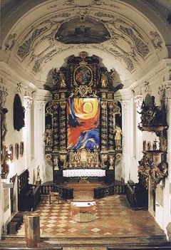 Kein Ostertuch, sondern das Fastentuch der Pfarrkirche Ostermiething ist auf dem Foto zu sehen. Gemalt hat es Adolf Bachler aus Raaba bei Graz. Seine Erklärung zum Bild: „Unten ist Gottes Schöpfung zu sehen. Es gibt Licht und Schatten. Leid, Krieg, Tod. Wirr durcheinander sind Kreuze erkennbar. Kein Mensch kommt daran vorbei. Über allen steht Christi Kreuz. Er ist für die ganze Welt gestorben. An der dunkelsten Stelle beginnt das Licht. Wie eine Flamme führt es über das Kreuz in die unbeschreibliche Herrlichkeit, angedeutet vom Weiß am Bildrand.