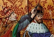 Weihnachtstag 800. Papst Leo III. krönte ihn in der Petersbasilika in Rom feierlich zum Kaiser. Die Kirche war in keiner erfreulichen Situation. Byzanz verfiel zunehmend und konnte so dem Apostolischen Stuhl keine Hilfe gegen die langobardischen Könige leisten. Da war vom Frankenland mehr zu erwarten. Dort bestieg 768 – einundzwanzigjährig – der hier Gesuchte den Königsthron. Er folgte seinem Vater Pippin. Der Papst und die Kirche mussten aber viel bitten. Dann zog der König der Franken, das zum mittelalterlichen Großreich im Abendland wurde, zur Krönung nach Rom. Hier erhielt er auch die Schlüssel der Grabeskirche in Jerusalem. Die Kirche suchte weltlichen Schutz für eigene Ziele – einen Kirchenstaat. Der gekrönte Kaiser dankte es mit Macht: Kirchenreform, Vereinheitlichung der Liturgie, christliche Grundbildung des Volkes, Bildung des Klerus, blutige Bekehrung der widerständischen Sachsen zum Christentum ... Der Kaiser starb 814 in Aachen. Gegenpapst Paschalis III. sprach ihn auf Druck Friedrich Barbarossas 1165 heilig. Der rechtmäßige Papst Alexander III. anerkannte dies nicht. Papst Benedikt XIV. gestattete den Titel Seliger.