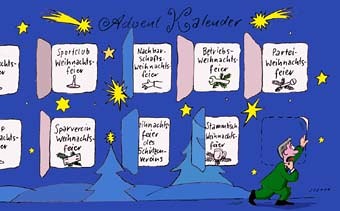 Das Jahr über ein banales Wirtshaustreffen, wird es Wochen vor Weihnachten umbenannt und kommt zudem gehäuft vor. – Dieser Advent ist einen Stern weit weg von Weihnachten!Karikatur: Jesner