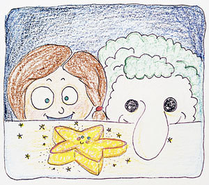 Mama hatte ihr innen ein paar Sternenlichter angebracht, die so schön funkelten. Sofort verschwand sie in ihre magische Traumwelt, wo ihr guter alter Freund, der kleine Pft, schon auf sie wartete. „Heute pflücken wir ein paar Sterne vom Himmel, mein lieber Pft. Aber nur die ganz kleinen, die man fast nicht sieht, damit der Sternenhimmel nicht leer wird!“ Pft war ganz aufgeregt und holte sofort Urliomas altes Fischernetz aus dem Keller. Auf einem Hügel hüpften sie abwechselnd dem Himmel entgegen und bei jedem Sprung konnten sie einige kleine Sterne einfangen. Sie sammelten sie in einer Keksdose und als sie voll war, gingen sie zurück zum Haus. In der Küche war eine alte Kaffeemühle. „Die ist genau richtig!“, freute sich Ricki-Ticki. Sie füllte die Sternchen ein und drehte die Mühle ganz lange rundherum, bis nur mehr feinster Sternenstaub übrig war. „Jetzt noch eine Prise Kümmel, eine Vanilleschote und drei Esslöffel Gummibärchen.“ Die beiden mischten die Zutaten in einer großen Schüssel mit dem Mixer, füllten den Teig in eine Sternenbackform und dann ab in den Ofen! Nach 35 Minuten war die Sternenstaubtorte goldgelb und roch ganz wunderbar. „Hm, mein lieber Pft! Das ist das allergrößte Tortenglück“, schwärmte Ricki-Ticki, als sie das erste Stück probierte.