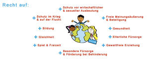 In dieser Grafik der UNICEF sind die zehn wichtigsten Kinderrechte veranschaulicht. Österreich war eines jener Länder, die die Kinderrechtskonvention am ersten Tag (26. Jänner 1990) unterzeichnet hatten. Nach der Genehmigung durch den Nationalrat am 26. Juni 1992 wurde die Konvention am 6. August 1992 ratifiziert. 30 Tage nach der Ratifizierung ist die Kinderrechtskonvention am 5. September 1992 in Österreich in Kraft getreten.