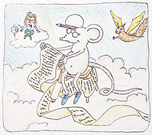 Plötzlich erreichten der kleine Pft und Ricki-Ticki ganz oben die Spitze hoch über den Wolken. Nanu? Was war denn das? Dort saß auf einem Hocker eine kleine, emsige Leseratte. Hinter dem Ohr eingeklemmt hatte sie einen Stift und in den Pfoten eine Papierrolle, auf der alle Buchtitel der Welt aufgeschrieben waren. Die Rolle war so lang, dass sie ein paar Mal um den Stuhl, auf dem sie saß, gewickelt war. „Sag’ einmal, liebe Ratte, was machst du denn da?“, fragte Ricki-Ticki neugierig. „Immer, wenn ein Kind auf der Welt einen neuen Tagtraum träumt, darf ich auf meine Liste ein neues Buch draufschreiben. So wird es immer neue Bücher geben.“ Das gefiel Ricki-Ticki sehr. „Eine tolle Erfindung, diese Bücher, nur gut, dass das Einhörnchen gerade Zeit hatte. Jetzt weiß ich, dass Bücher nicht nur Buchstaben sind, sondern unter einen Deckel gepresste Tagträume.“