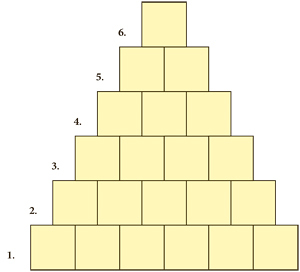 In die 21 pyramidenhaft angeordneten Felder sind 21 verschiedene Zahlen einzutragen. Dabei gelten folgende Bedingungen:: Es sollen möglichst kleine, ganze, positive Zahlen sein (1, 2, 3, 4 ...). Die Zahlensumme jeder Ebene (1. bis 6.) muss gleich sein.