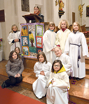 Zehn Ministrantinnen aus der Pfarre Aspach haben an einem Nachmittag einzelne Bilder nach den Evangelien der fünf Fastensonntage, Palmsonntag und Karfreitag gemalt. Die Bilder wurden zusammengenäht und zu einem Fastentuch zusammengefügt. Bis zum Ende der Fastenzeit hängt es vor dem Ambo der Pfarrkirche Aspach und begleitet die Gottesdienstgemeinde durch die Fastenzeit.