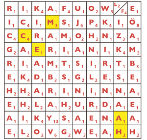 Auf dem Raster rechts liegen 101 Buchstaben (in einem Feld stehen zwei Buchstaben zur Wahl). Es verbergen sich fünf namhafte oö. Wintersportler/innen von einst und jetzt, jeweils mit Vor- und Zunamen (in dieser Reihenfolge). Sie sind durch richtiges Ziehen zu finden. Die fünf Startfelder sind gelb markiert. Die Scrabble-Zahl bei jedem Buchstaben gibt die Zugweite an. Gezogen wird nur waagrecht und senkrecht. Die Richtung kann nach jedem Stopp geändert werden und auch, wenn man im Zug an den Rand stößt (da nur im rechten Winkel). Man darf ein Feld auch mehrmals betreten. – Wie heißen die fünf Sportler? Welcher Name bringt die meisten Scrabblepunkte? Schicken Sie uns Ihre Antwort bis 14. Februar. Adresse: KirchenZeitung, Kapuzinerstraße 84, 4020 Linz, E-Mail: service@kirchenzeitung.at