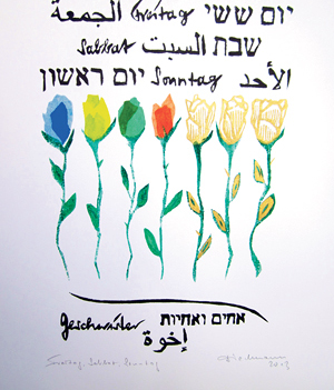 Er war Lehrer, Theater-, dann Opernregisseur – und wandte sich schließlich der Holzschnitt-Kunst zu. Felix Dieckmann ist ein Weltenverbinder, nicht nur in den verschiedenen Sparten der Kunst, sondern auch was das Thema Religionen betrifft. In der Galerie der Generali-Versicherung in Linz sind zurzeit jene Arbeiten zu sehen, die er im Herbst 2013 in Jerusalem gezeigt hat. Die gemeinsamen Grundthemen von Christentum, Judentum und Islam bringt er in 14 Holzschnitten zum Ausdruck. Den Ausschlag, sich genau dieses Themas anzunehmen, gab eine Art Ohnmacht: „Zum so und so vielten Male hatten in Israel Angehörige einer religiösen Gruppe gegen Angehörige einer anderen religiösen Gruppe Gewalt ausgeübt. Oder umgekehrt oder umgekehrt oder umgekehrt.“ So beschreibt Dieckmann sein Motiv für den Bilderzyklus. „Was konnte ich als Einzelner tun? – Das Einzige, das ich machen kann, sind Bilder – und so ist der Holzschnitt-Zyklus entstanden.“ Der Gehalt dieser Bilder – so Dieckmann – legt eigentlich ein friedliches Nebeneinander nahe. Doch die Religionen werden entgegen ihren eigenen Inhalten instrumentalisiert, um Gewalt zu legitimieren. Die Klammer für die 14 Holzschnitte bildet die „Ringparabel“ aus Gottfried Ephraim Lessings „Nathan der Weise“ mit ihrem Toleranzgedanken. Auf wie schwierigem Boden sich die Toleranz zu bewähren hat, erlebte Dieckmann in Jerusalem persönlich, als er in einen Konflikt um die Al-Aksha-Moschee hineingeriet. Straßensperre, Geschrei, gepanzerte Pferde, ein Mann, der aus einem Protestzug heraus verhaftet wird, Wasserwerfer, Fernsehkameras, überall Hektik, ein sehr nervöser Obsthändler – dann endlich wieder im Hotel. „Ich hab' mich schon gefragt, was dann so etwas wie mein Ausstellungsprojekt sein soll: Ist es lächerlich? Ist es sinnvoll?“ „Beides“, kommt er zum Schluss: „Es hat Sinn aufzuzeigen, dass unsere Gemeinsamkeiten jeder Vereinnahmung der Religionen widersprechen.“