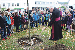 Der 500. Geburtstag der Pfarrkirche Vöcklamarkt wird ein ganzes Jahr lang mit zahlreichen Feierlichkeiten gefeiert. Eine davon war das Erntedankfest am 6. Oktober mit Altbischof Maximilian Aichern. „Die Pfarrkirche ist ein Thronsaal Gottes, den man nicht so leicht vergisst. Und doch besteht dieses Gotteshaus aus toten Steinen – ihr aber seid die lebendigen Steine, die zusammenstehen und füreinander sorgen“, gab er der Pfarrbevölkerung mit auf den Weg. Zur Erinnerung an das Jubiläum pflanzte er nach der Messe mit den Kindern der Pfarre einen Baum im Kirchenpark.