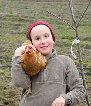 Nachdem sich unsere Tochter Eva beklagt hatte, sie hätte kein eigenes Haustier, wandte sie sich eben unseren Hühnern zu und begann, sie zu zähmen und zu trainieren. Ich meine, den Hühnern hat das gefallen ... Maja Ströbele, Ostermiething