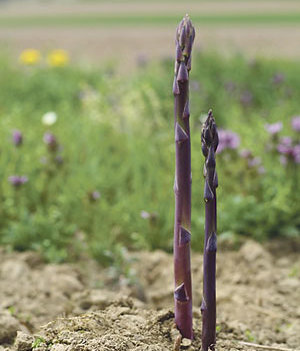 Die Schale des Grünspargels und des Purpurspargels ist vergleichsweise feiner, sie müssen daher gar nicht bzw. in seltenen Fällen lediglich im unteren Drittel geschält werden. Beide werden im kochenden Salzwasser mit einer Prise Zucker bissfest gegart. Tipp: Der Grünspargel behält seine intensivgrüne Farbe, wenn er unmittelbar nach dem Kochen in Eiswasser abgeschreckt wird.
