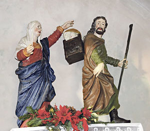 Maria mit Jesus auf dem Schoß auf einem Esel sitzend – das ist das vertraute Motiv der Flucht Jesu nach Ägypten. Die Darstellung in Schönbühel/NÖ fällt aus der Reihe und ist eine kunstgeschichtliche Rarität: Sie zeigt Josef, der Jesus im Buckelkorb trägt.